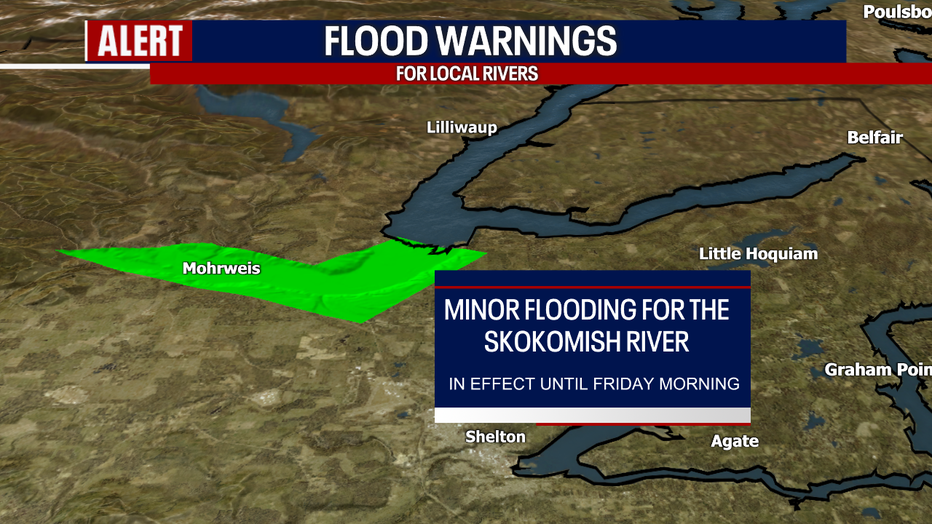 There are a couple of rivers dealing with high water. The Skokomish and Nooksack rivers are at minor flood stage. A wetter system will move in late Tuesday into Wednesday, bringing more significant rain to the Olympics (2 to 3 inches) and cause the Skokomish to remain in flood stage through Friday.