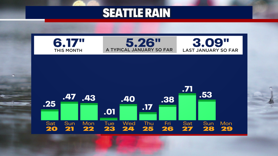 It has been a very wet couple of weeks in Western Washington. Sea-Tac has measured rain 13 days in a row. With 6.17 inches of rain so far, this month has exceeded the average rainfall for January (5.78 inches) with a few days left to go.