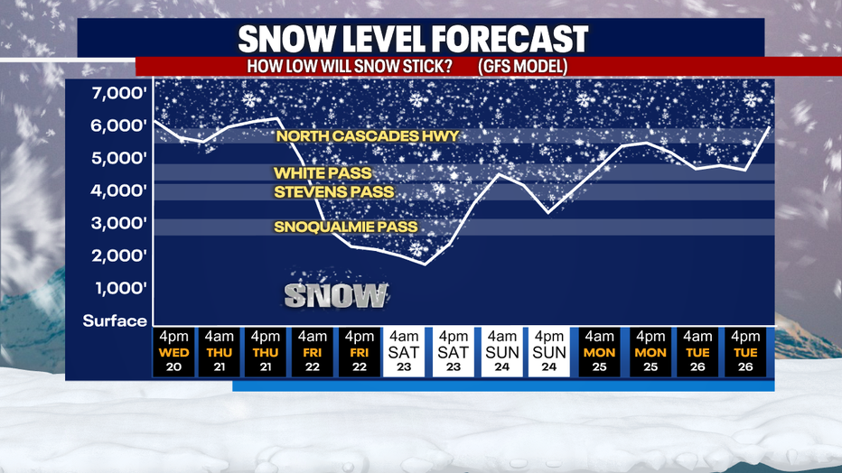 Higher pass levels like Stevens Pass (around 4,000 feet) will see rain transition to snow first. That's why totals will be higher there. overall, expect two to eight inches of snow over the passes by Saturday morning.