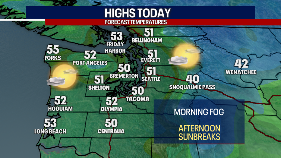 High temperatures will top out in the low 50s around the sound. Later today, a system will push north into British Columbia, bringing more clouds into the area. Another round of low level clouds and fog is expected Thursday.