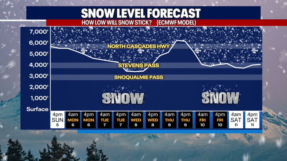 Lingering showers are on the way for Tuesday. Snow levels could lower a bit, possibly producing a couple inches of snow for Stevens and White Passes.
