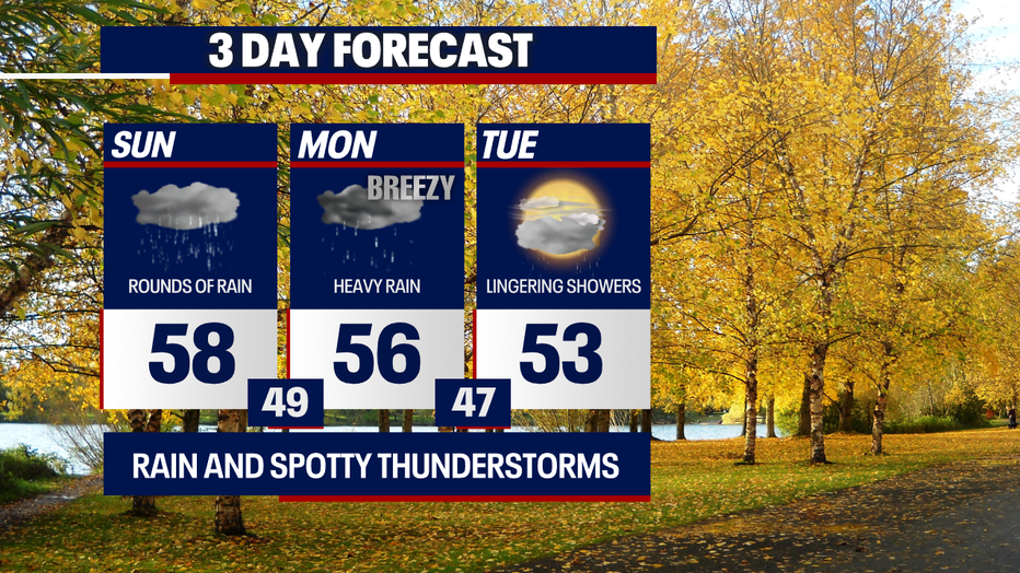 Rounds of rain, spotty thunderstorms Sunday and Monday