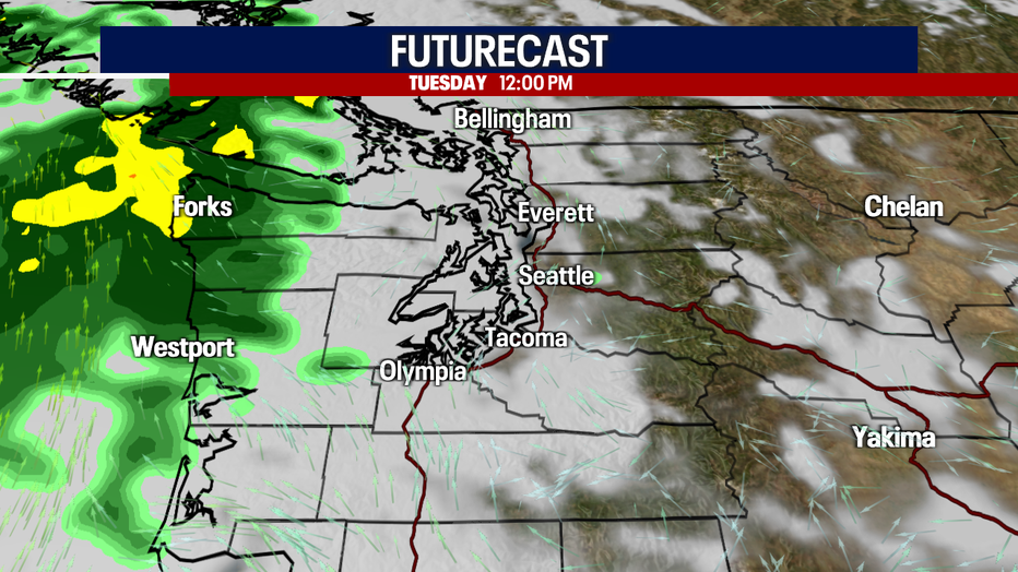 A light passing shower could brush through Puget Sound by 10 a.m. tomorrow, but there's a better chance for pockets of rain Tuesday evening. The rain tomorrow morning will be mostly focused over the coast and Olympic Peninsula.