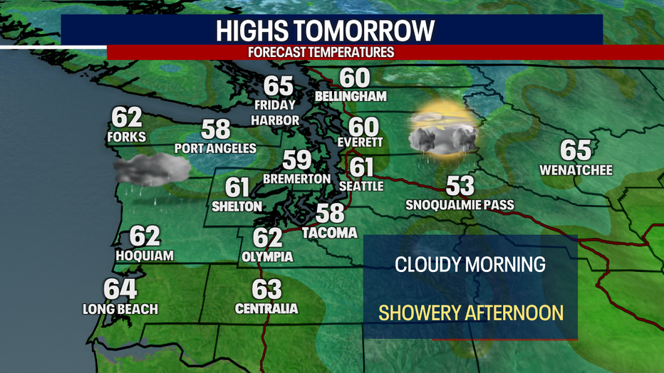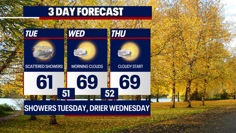 SEATTLE - After a rather soggy day, fewer showers are forecast tonight and Tuesday. Drier weather is expected on Wednesday.