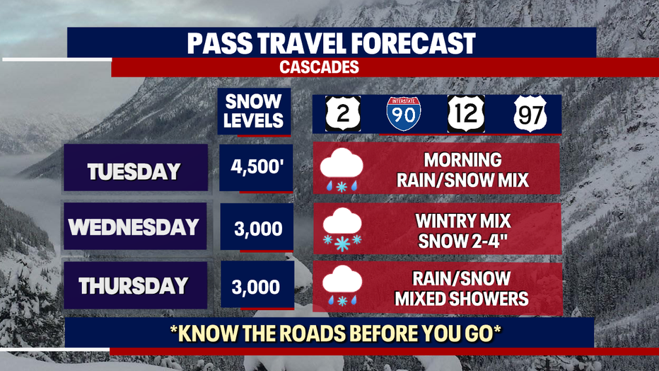 Snow levels will be high Tuesday, with a mix of rain and snow showers possible in the morning for the passes. Mixed rain and snow showers through the middle of the week.