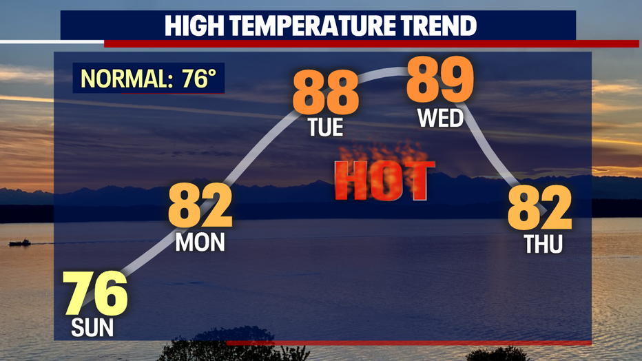 Any pockets of clouds this morning will clear for sparkling afternoon sunshine. Highs will warm to about 76 degrees in Seattle which is the average high today. By Tuesday, temps skyrocket once again to the upper 80s. Tuesday will be the hottest day this week for the South Sound. Wednesday will be the hottest day for Seattle, Everett and Bellingham.