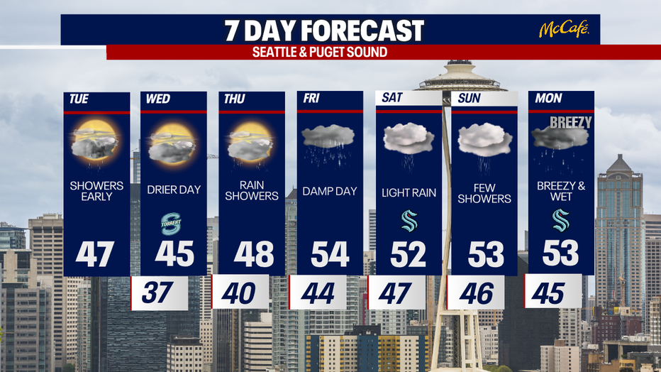 SEATTLE - Tuesday and Wednesday are looking mainly dry and cool, with cool afternoon temperatures.