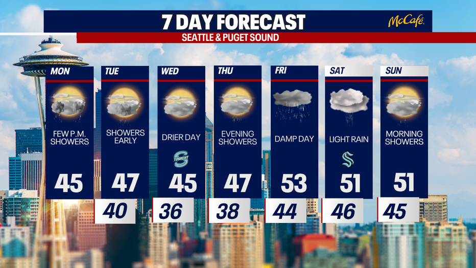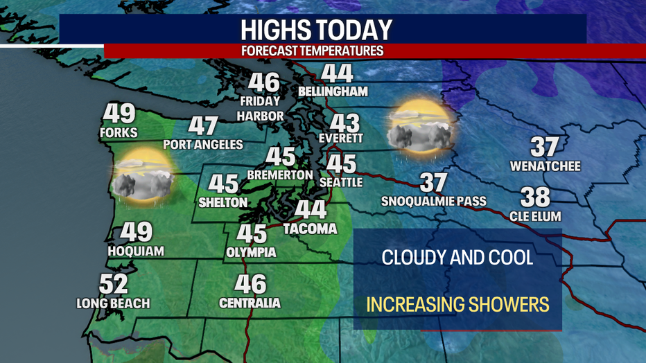 Western Washington will see a round of light showers this Monday afternoon, with another round of overnight showers. High temperatures will remain cool, in the mid 40s.