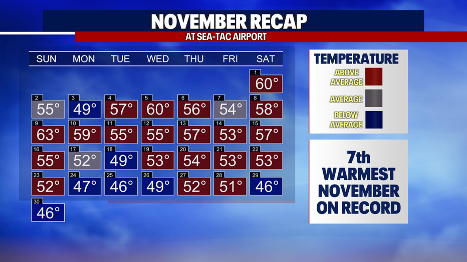 It was the seventh-warmest November in Seattle in 81 years. We ran 2.1 degrees above normal with an average temperature of 48.6 degrees. So, what does that mean for December? Eight out of the 10 warmest Novembers had a cooler than average December. We are certainly starting the month off chilly today.