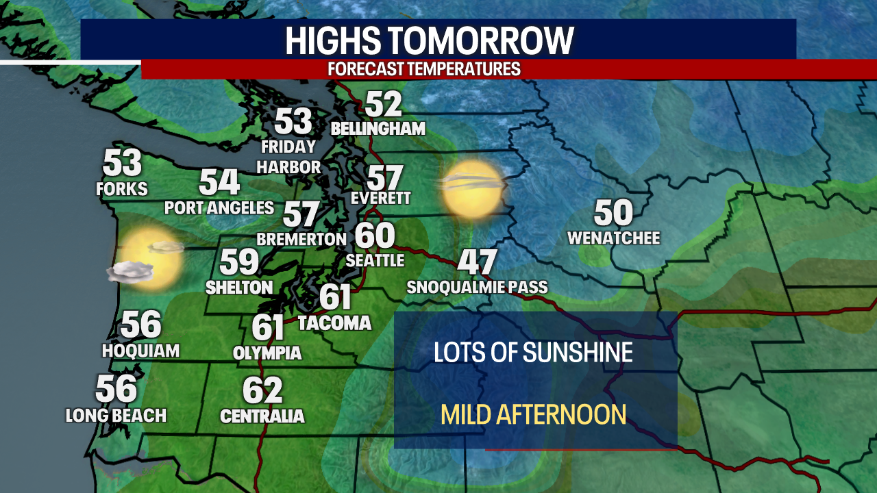 Another mild day is forecast for Thursday with highs back into the low 60s. Our 60-degree weather is right on time in western Washington. We typically see our first 60-degree day around February 22nd. The earliest we've seen it is Jan. 3rd of 2020, and the latest was April 11, 1954. Luckily, we don't have to wait that long this year to see a little warmth.