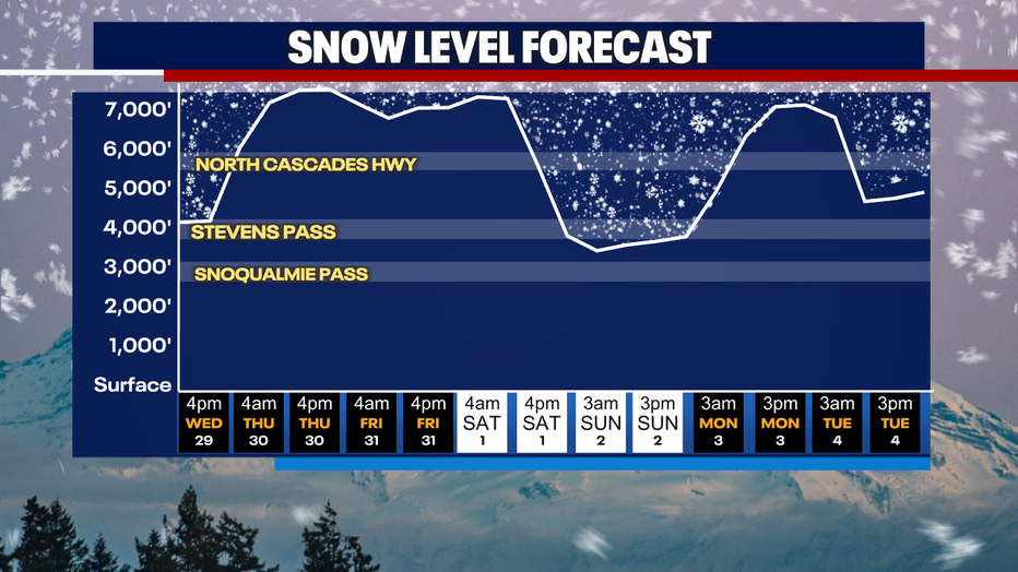Snow levels will be high, so this storm will be a wash-out in the mountains. 3 to 5 inches of rain is expected in the Olympics and the northern Washington Cascades.