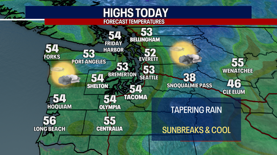 Friday morning showers will wrap up by the afternoon as sunshine makes a triumphant return to western Washington after a couple of stormy days. High temperatures will be cool, in the low to mid 50s.