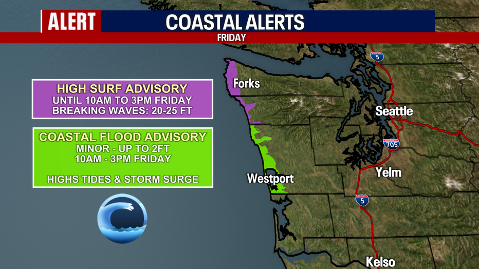 A high surf advisory is still in place on the coast, but will likely expire later today. A coastal flood advisory will stay in place through the afternoon hours for Grays Harbor County. Finally, a flood warning is still in place for the Skokomish River in Mason County through Saturday morning.