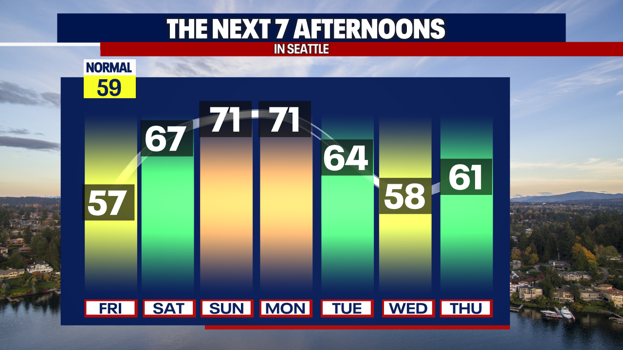 Seattle weather turns warmer and partly sunny Sunday into Monday with highs in the low 70s. (FOX 13 Seattle)