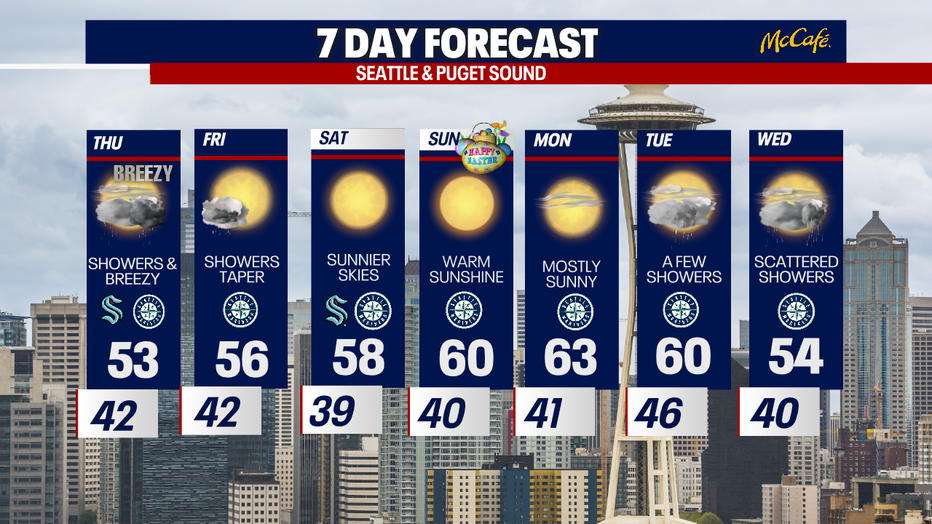 Rain will be likely around First Pitch for the first pitch at the Mariner's Home Opener. Scattered showers will continue into the evening.