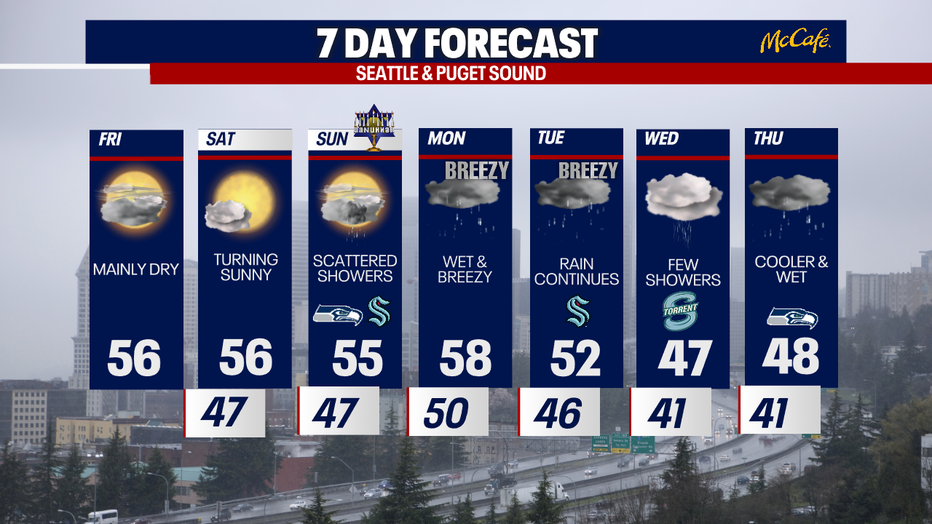 Western Washington will stay dry through Saturday, with the next round of rain showers arriving early Sunday morning and continuing through the afternoon.