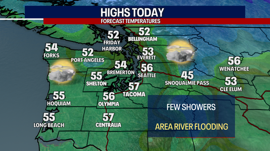 Skies will be much drier Friday as we see the atmospheric river move out of Western Washington. High pressure will slowly build back in for Friday and Saturday, aiding in the rivers receding and for the soil to dry out.