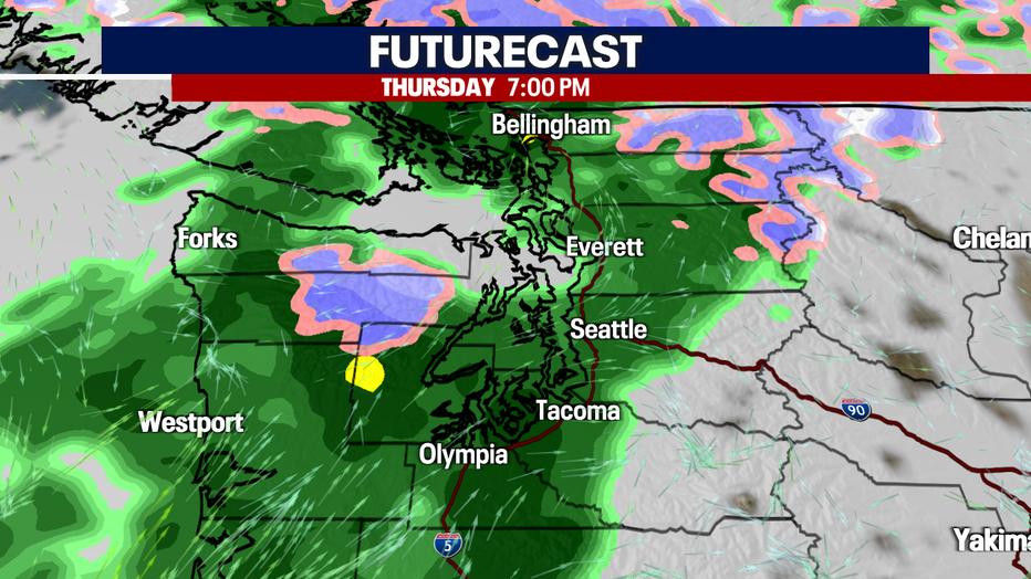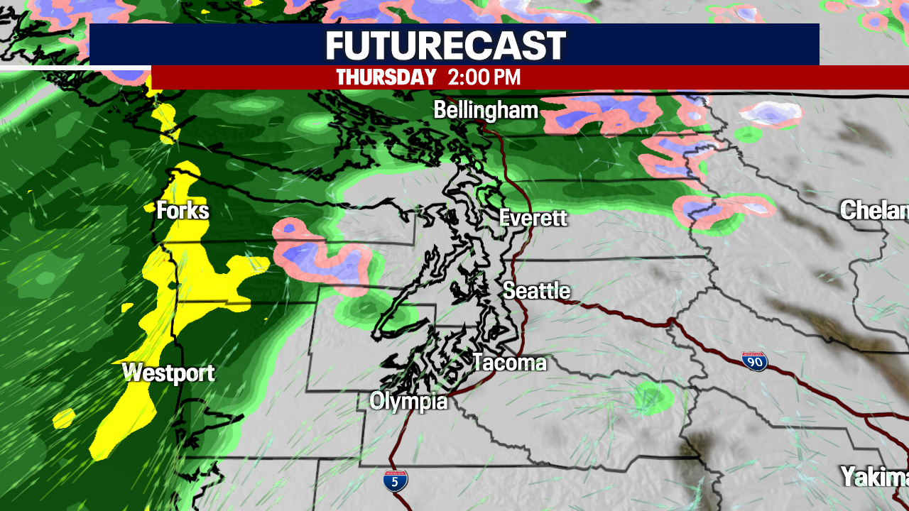 A disturbance will drop into Western Washington, increasing rain chances. Rain will begin along the coast on Thursday with light rain to our north as well in Snohomish, Skagit and Whatcom Counties.