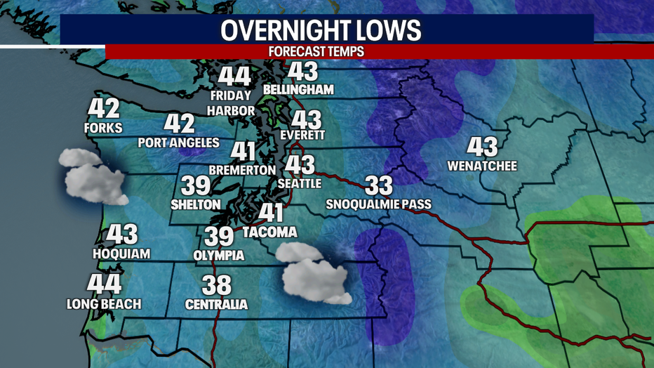 Seattle - After enjoying some sunshine this morning and afternoon, clouds returned by the evening. Overnight lows will be a little warmer tonight, dropping into the low 40's in most spots.
