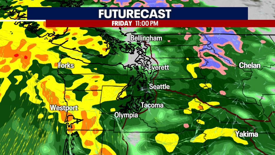 Heavier rain returns late Friday through Saturday, which will also bring gusty winds (~30 mph) and a chance of afternoon thunderstorms.