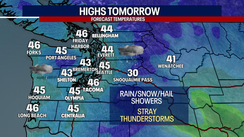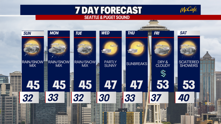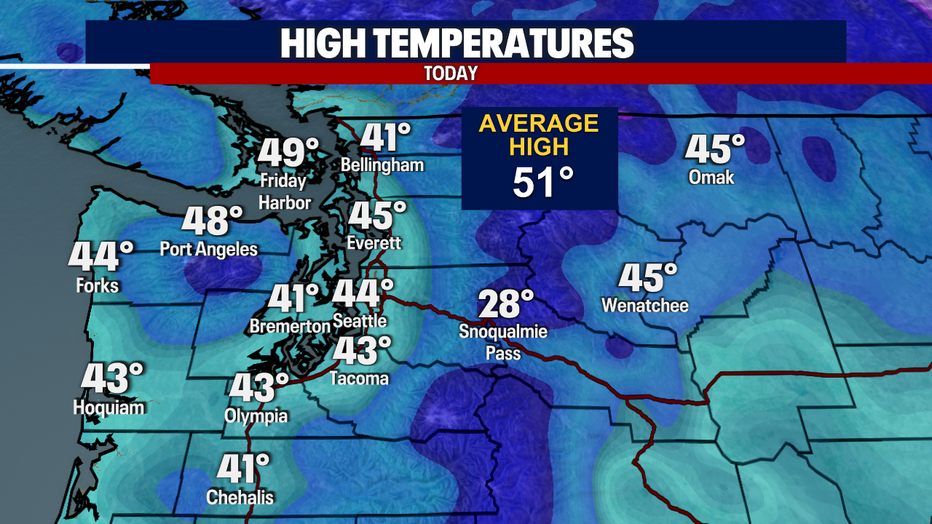 Seattle - The unseasonably cool weather continues in our area with highs today still running in the low to mid 40's in many spots. A few locations like Port Angeles and Friday Harbor got a little warmer, into the upper 40's. We are tracking some warmer temperatures by next weekend.
