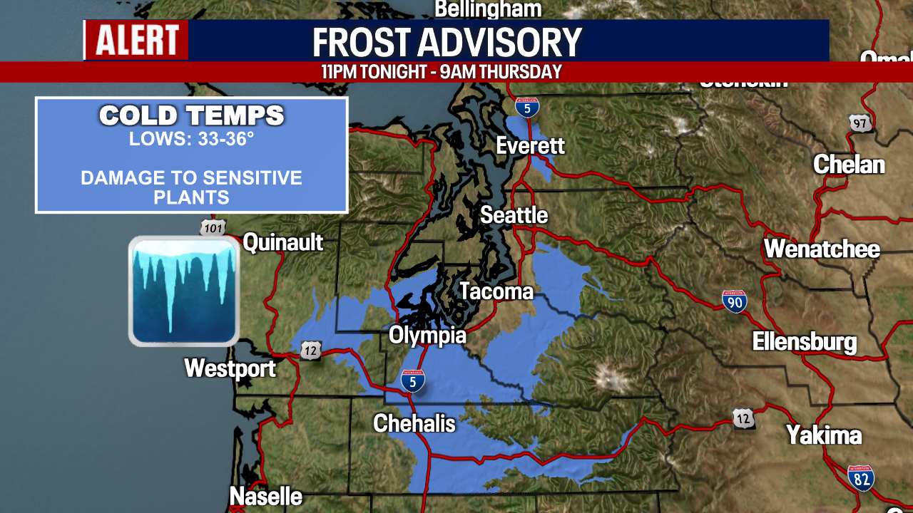 SEATTLE - A Frost Advisory is in effect for the Everett area, Cascades foothills and the Olympia area southward due to chilly morning temperatures through 9:00 a.m. Thursday.