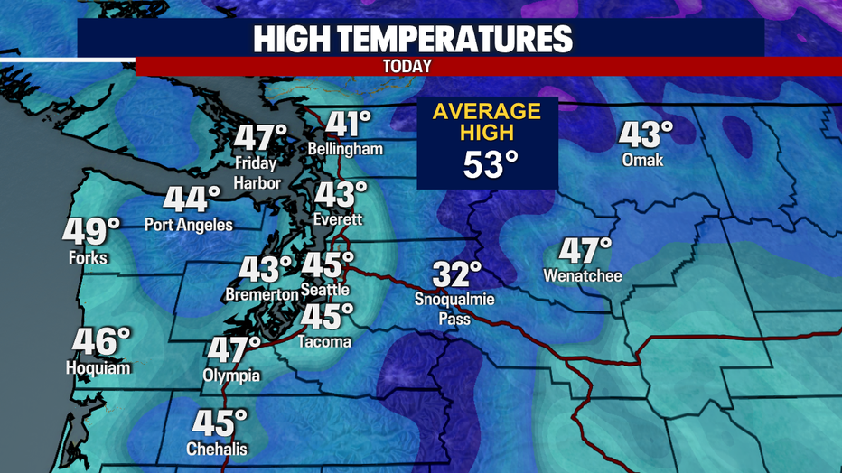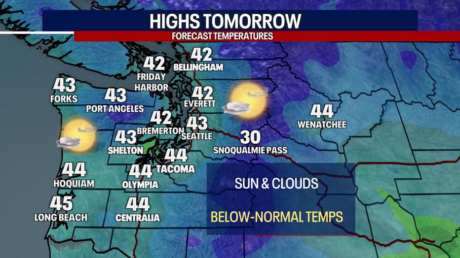 Welcome sunshine returned today for the Pacific Northwest, but the temperatures remained chilly and below average. Highs today almost 10 degrees below average, in the mid to low 40s.