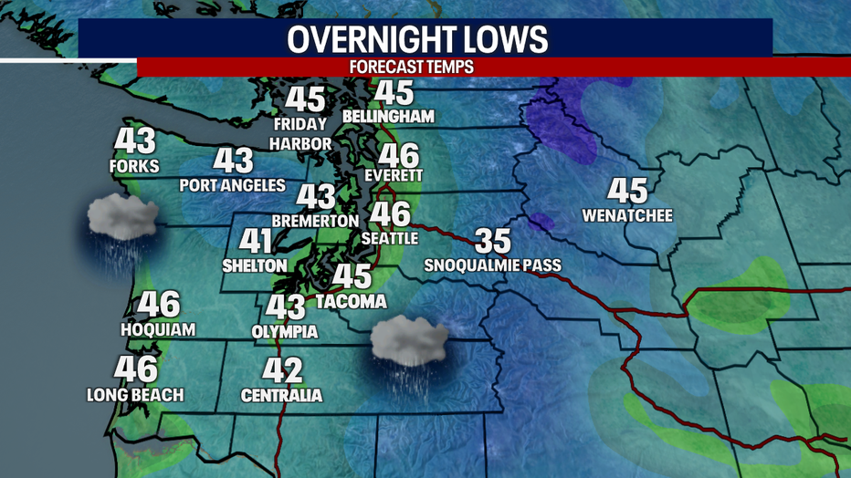Overnight lows will be below the seasonal average, staying in the mid 40s.