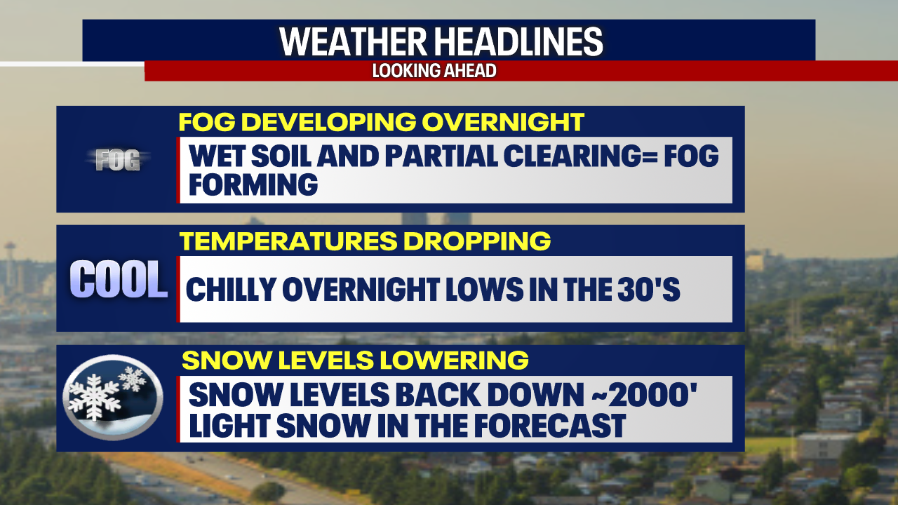 The recent rains, along with partial clearing, will allow for some fog development overnight tonight, into Saturday morning. We will likely see fog again early Sunday morning, too. Overnight lows will also feel quite a bit chillier compared to the last several evenings. Cooler air will also allow snow levels to drop once again, although not a lot of moisture around to get significant snow to fall.