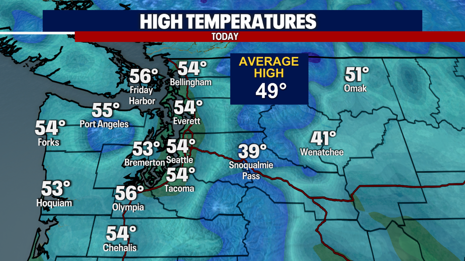 Much of Western Washington will see gradual drying over the weekend. A few spotty showers may remain for Saturday with highs near normal, in the upper 40's and low 50's. Sunday looks to be the choice day this weekend with more blue skies and temperatures in the 40's.