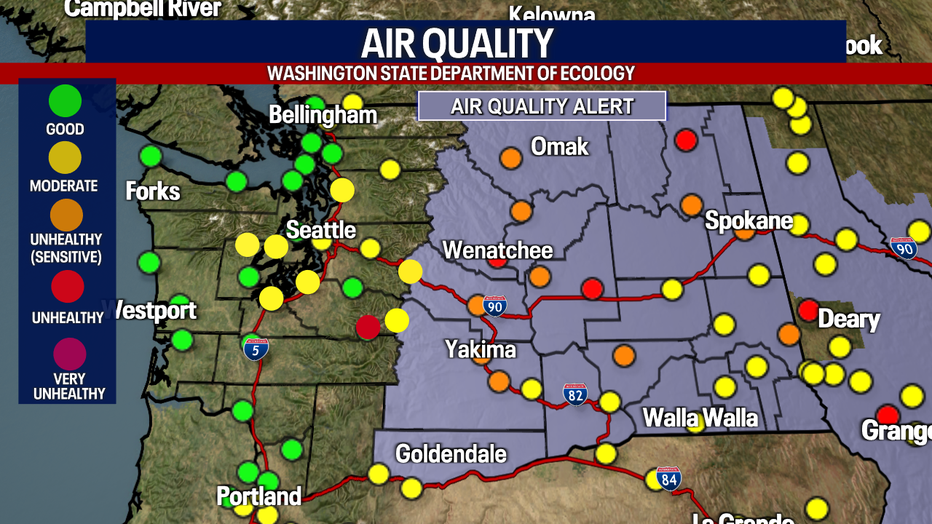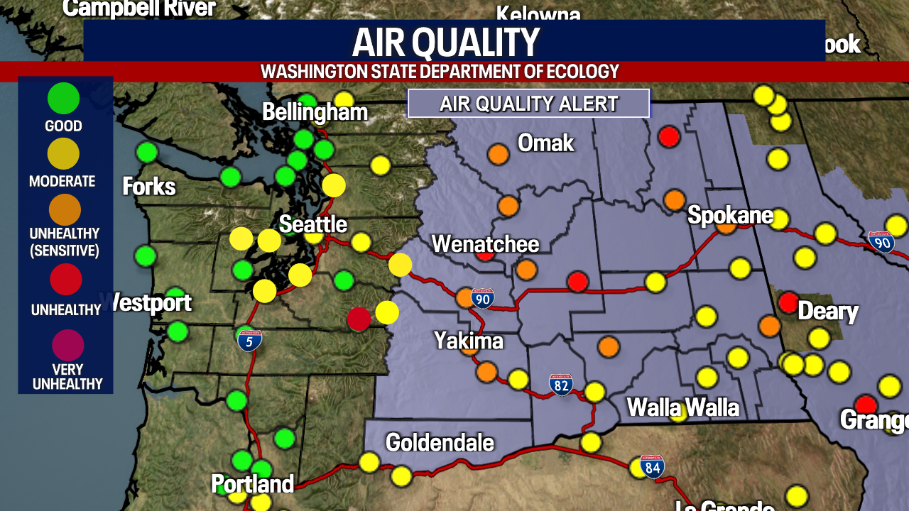 A dozen large wildfires are burning east of the Cascades, and every Central and Eastern Washington county is under an Air Quality Alert, due to surface level wildfire smoke. Many spots will reach the "unhealthy" category east of the mountains.