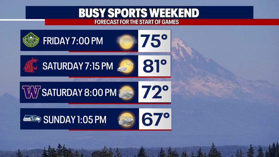 We have a busy sports weekend in Washington State. While it looks more dry than wet in Seattle, we do have a chance of showers for the Huskies and Seahawks games.