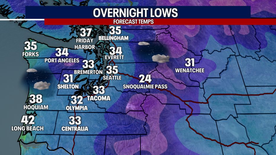 Clearing skies will lead to a cool morning on Wednesday with lows near freezing in some spots. (FOX13 Seattle)