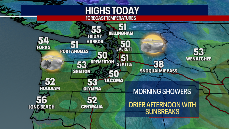 A convergence zone will persist in parts of Central Puget Sound this morning (for example, Snohomish County). Isolated downpours could still develop this afternoon, but most communities will enjoy sunnier and drier skies. Highs lift to the low 50s for most.