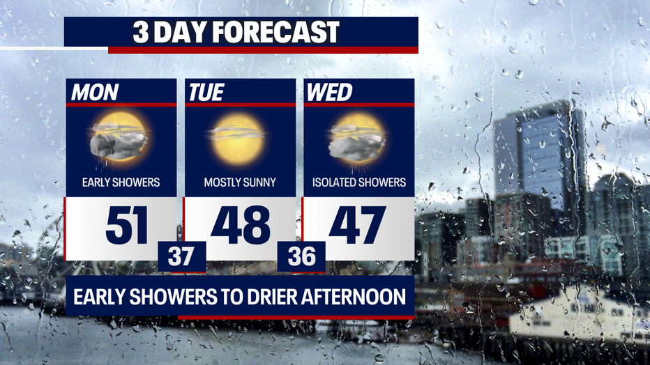 SEATTLE - After a sloppy start to the day in some neighborhoods, we're forecasting mostly dry weather Monday afternoon through Tuesday.