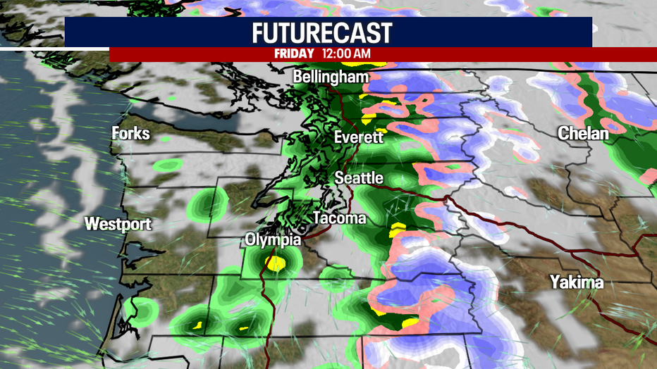 During the daytime on Friday, only isolated showers are expected. Late Friday into early Saturday, rain and wind make a comeback across Western Washington. Some of the typical areas (Salish Sea, Northwest Interior and the coast) could experience strong winds with at least some minor damages and power outages. It may be gusty elsewhere as well. There's still uncertainty about how forceful the winds could be, so stay tuned! It'll also be rainy.