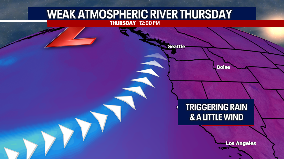 A super weak atmospheric river will provide us with scattered rain and slightly blustery conditions Thursday afternoon. This will be a fairly minor event, but wet roads could make driving tricky for the second half of the day.