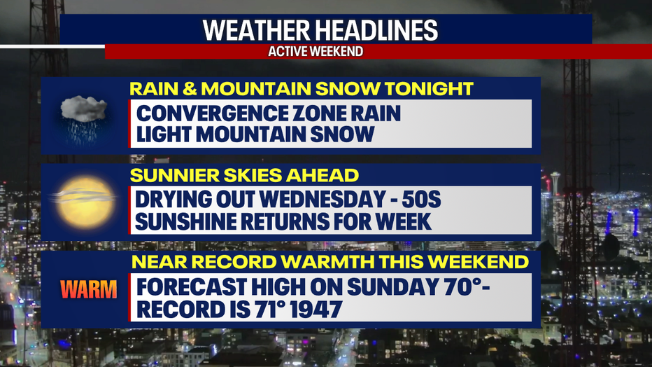 Scattered showers are tapering this evening along with a few snow showers in the Cascade passes. We will start to see increasing sunshine and warmer temperatures into the weekend. The 70s are possible for some!