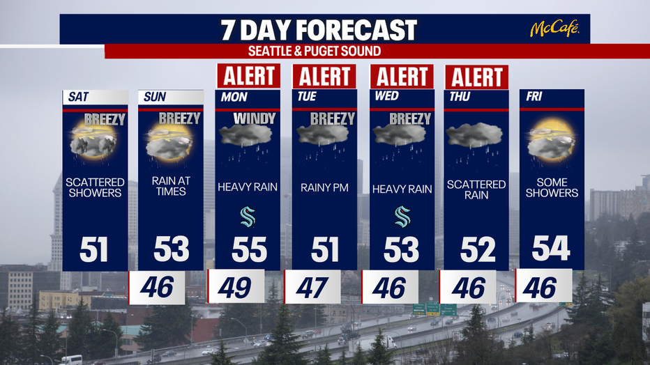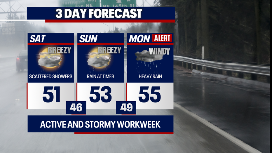SEATTLE - While it'll be breezy and damp at times this weekend, much stormier weather is forecast by Monday.