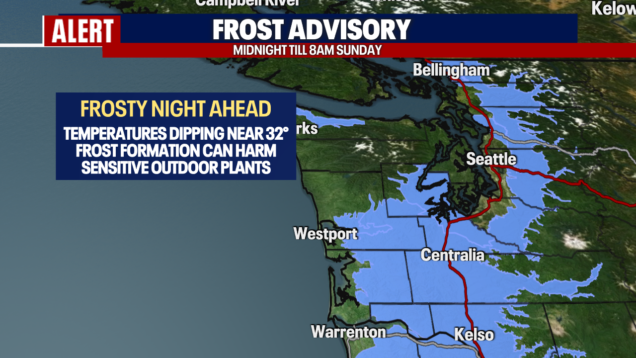 Seattle - We enjoyed a nice mix of sun and clouds on Saturday with a few light showers that lingered in the foothills into the late afternoon. High temperatures were still a little cooler than average, topping out in the low and mid 50s. The ridge will begin to build in by tonight with a drier, northerly wind. This will bring in cooler air from Canada overnight and early Sunday morning. A Frost Advisory is in effect beginning at midnight till 8am. Be sure to care for the tender plants to ensure they are protected from the cold tonight.