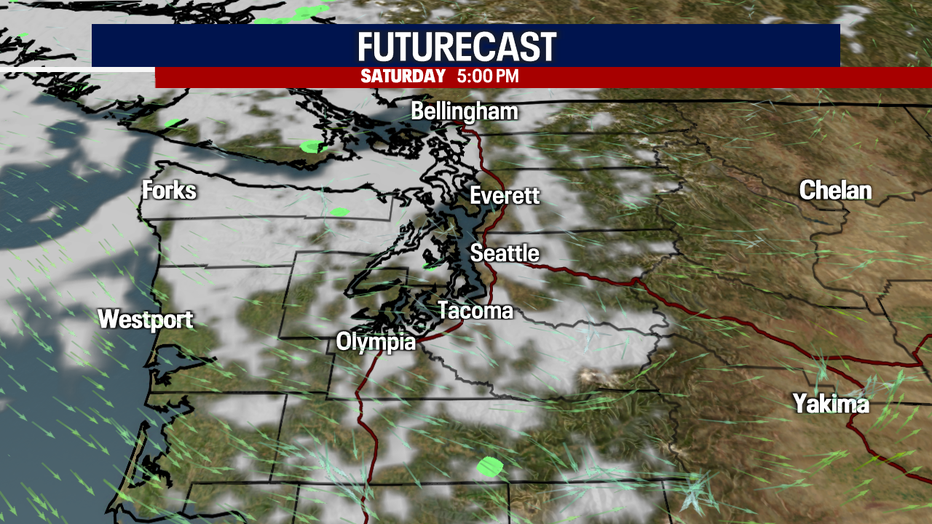 Early Saturday, some sprinkles and drizzle could bubble up in Puget Sound. Otherwise, cloudy skies in the morning will give way to afternoon sunbreaks. Highs will warm into the low to mid 70s.