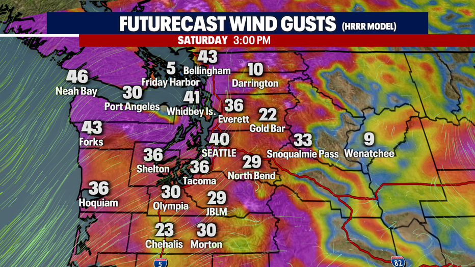 Winds through Saturday afternoon will be gusty around the Pacific Northwest as well, gusts between 25-35 mph and could create more power outages and down tree branches.