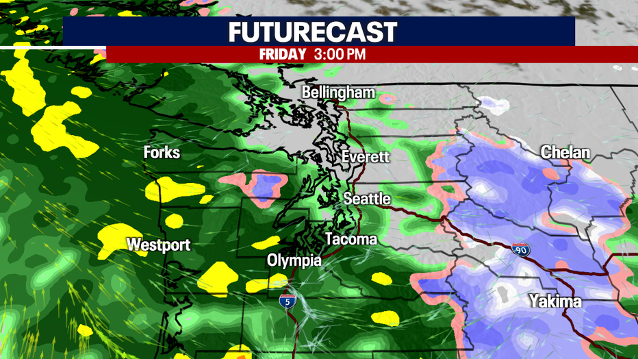 By Friday, the subtropical jetstream will set up pointing right into the Pacific Northwest. This will push in very warm, moist air leading to periods of heavy rain, very mild temperatures and rising snow levels.