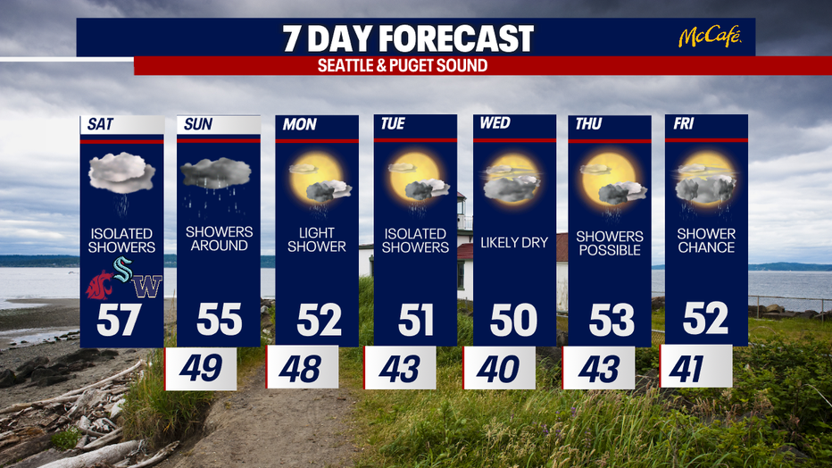 Highs will be mild this weekend in the mid to upper 50s. A few spots could even approach 60 degrees in the greater Seattle area on Saturday afternoon. Keep a rain jacket with you in case showers develop overhead.