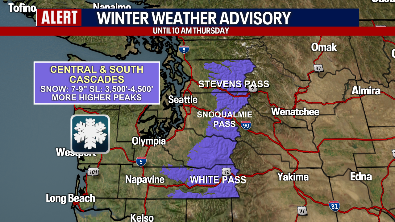 SEATTLE - Snow will continue for the Cascades Thursday, with heavier amounts especially above 3500' through the morning. A Winter Weather Advisory remains in effect until 10 a.m. Thursday for the mountains above 3500' for 7-9" of snow.