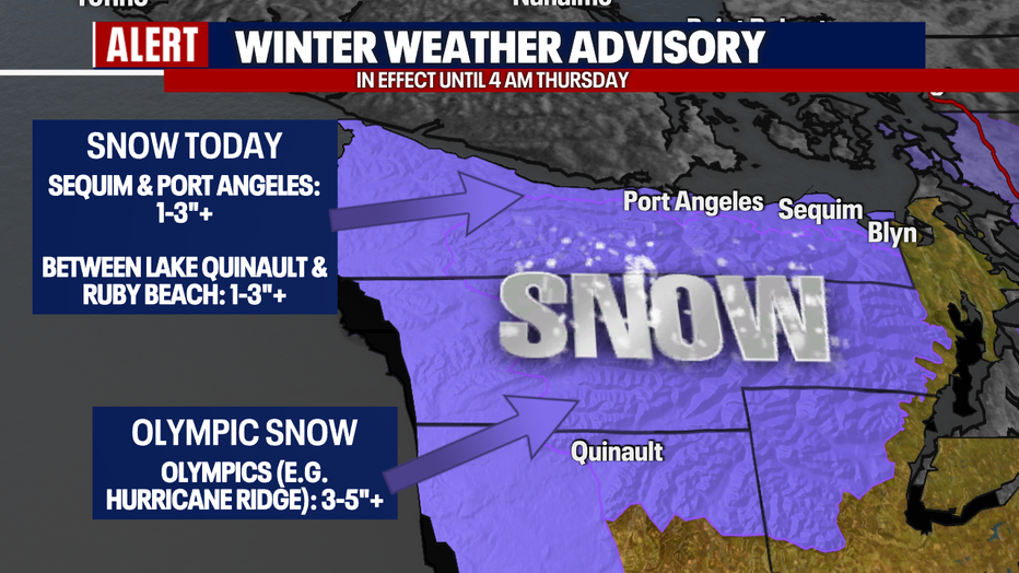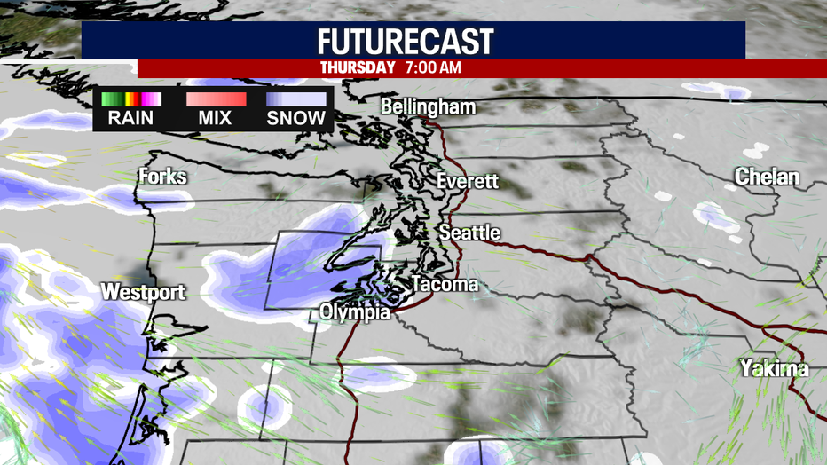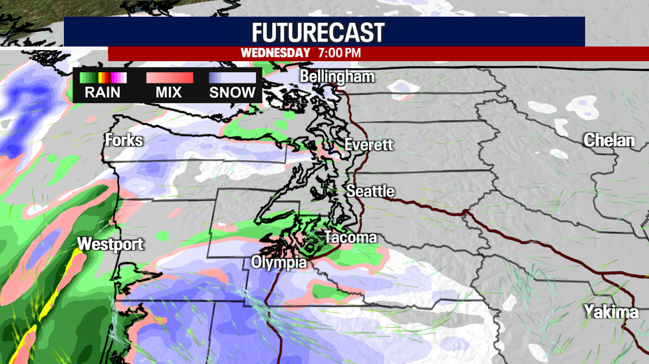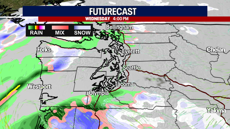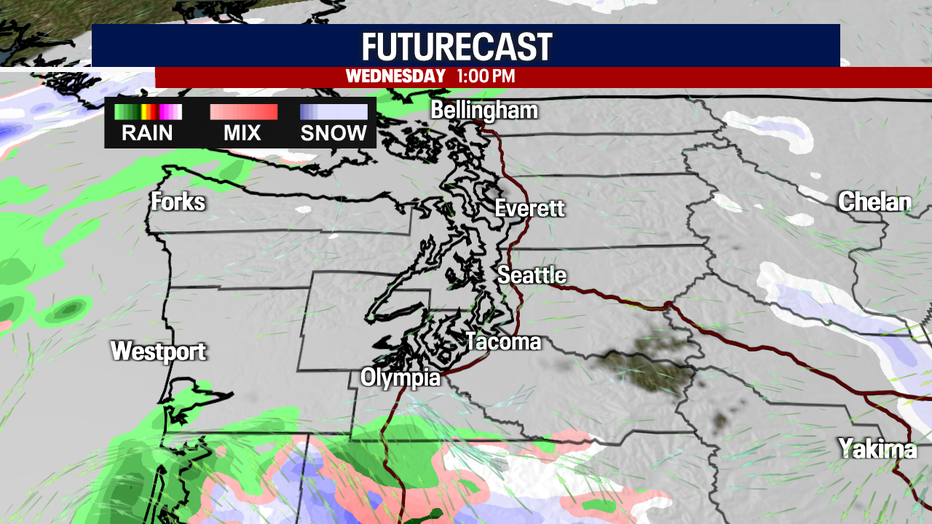 For the rest of this afternoon, we expect mainly dry weather along the I-5 corridor from Tacoma through Bellingham. We can't rule out a few spots of snow returning to Puget Sound, but the brunt of the action for the rest of your Wednesday will be over the South Sound and the Olympic Peninsula.