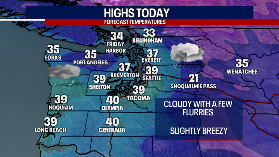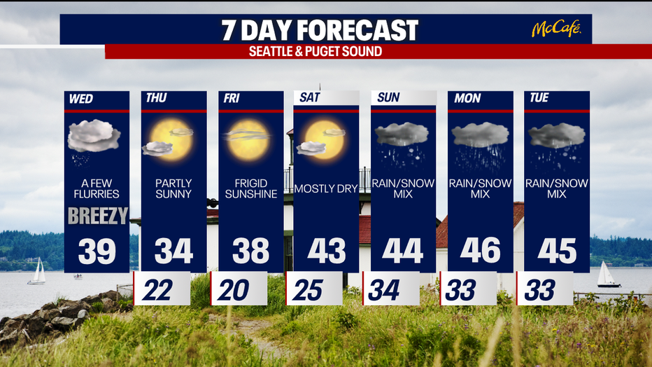 Friday remains frigid, but the sunshine will be spectacular. Saturday will be lovely as well, featuring a mixture of sunshine and clouds. Late Saturday, lowland snow could return to Western Washington, but there's still a lot of uncertainty about what to expect.