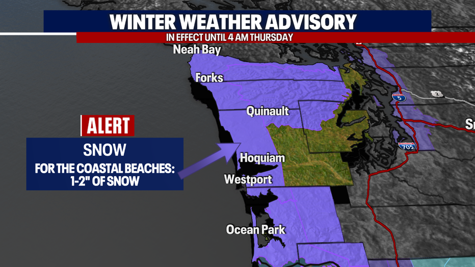 Right now, it seems that a lot of rain/snow today will be focused along and south of Olympia. Snow and rain will also be on-and-off over the Olympic Peninsula, coast, the Hood Canal, Port Angeles and Sequim. Remember that snow forecasts are very challenging and subject to change. Check out the possible snow totals in the Winter Weather Advisory below: