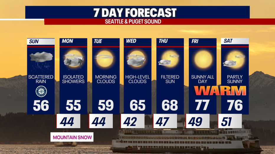 Tomorrow, isolated showers continue. Overnight and Monday, there could even be light mountain snow for the passes (particularly for White and Stevens Passes).