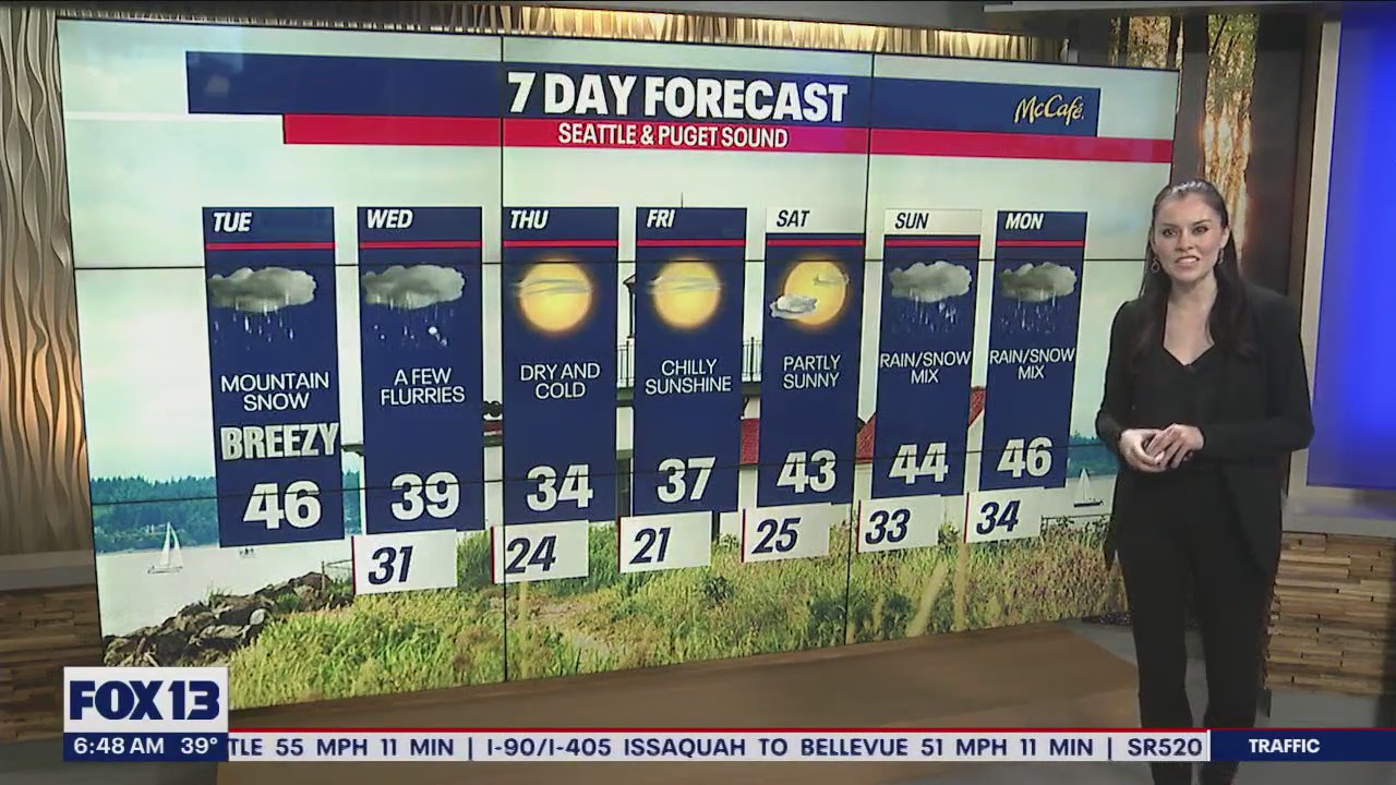 SEATTLE - Snow continues to pummel the mountains on Tuesday. Tuesday night into Wednesday, there's a chance for lowland snow. However, the possibility is super slight. Accumulations are unlikely for most.